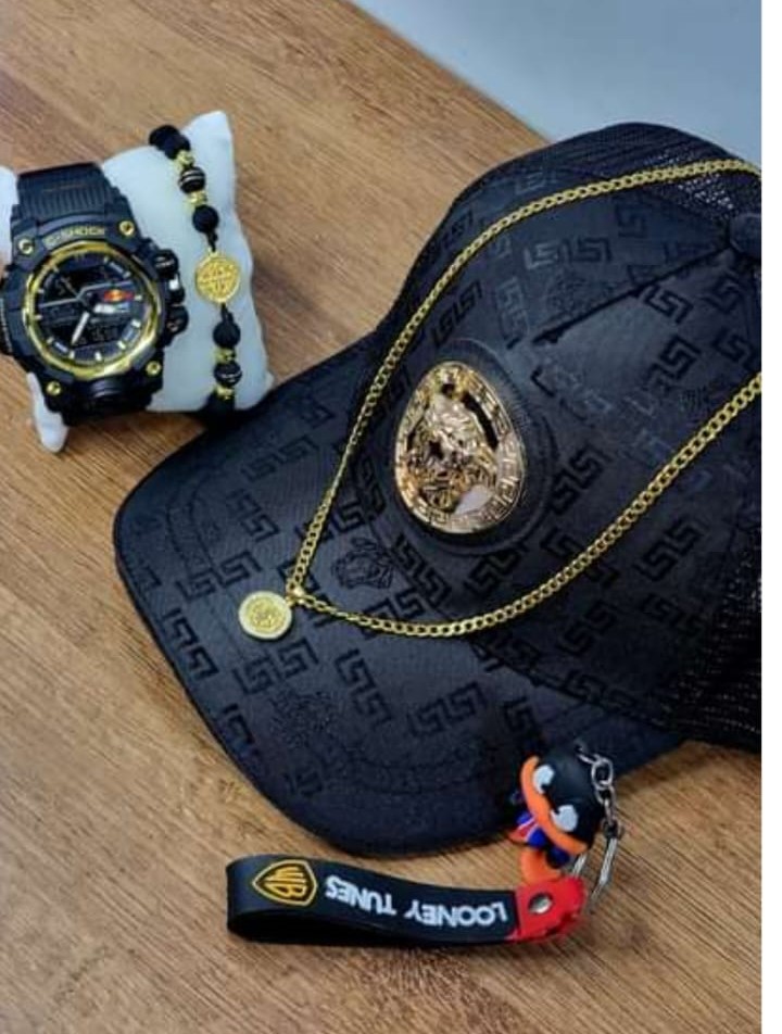 Combo Gorra Reloj Negro Dorado Cadena Pulsera Llavero